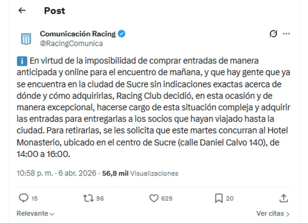 “En virtud de la imposibilidad de comprar entradas de manera anticipada y online para el encuentro y que hay gente que ya se encuentra en la ciudad de Sucre sin indicaciones exactas acerca de dónde y cómo adquirirlas, Racing Club decidió, en esta ocasión y de manera excepcional, hacerse cargo de esta situación compleja y adquirir las entradas para entregarlas a los socios que hayan viajado hasta la ciudad”, informaron desde el club a través de un comunicado oficial.