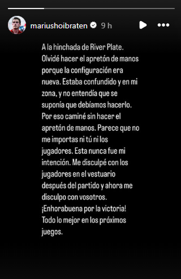 “Parece que no me importan los fanáticos o los jugadores de River, pero esa nunca fue mi intención. Lo lamento sinceramente”, escribió Høibråten, que también felicitó a sus rivales por el triunfo: “¡Felicitaciones por la victoria! Les deseo lo mejor en lo que sigue”.
