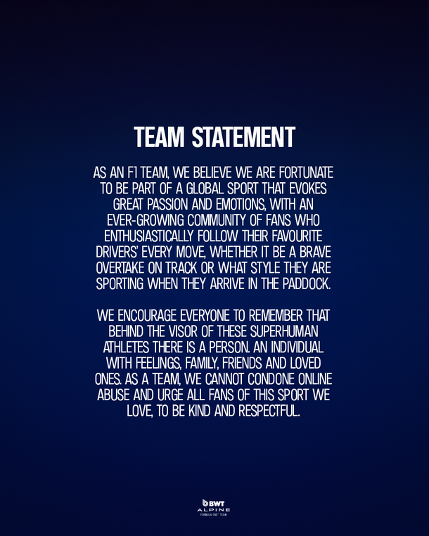 "Animamos a todos a recordar que tras la visera de estos atletas sobrehumanos hay una persona. Un individuo con sentimientos, familia, amigos y seres queridos. Como equipo, no podemos tolerar el abuso en línea e instamos a todos los aficionados de este deporte que amamos a ser amables y respetuosos", escribieron en un documento publicado en redes sociales.
