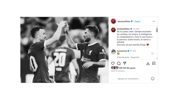 Más extenso y personal fue el homenaje de Mac Allister, quien fue compañero de Jota durante dos temporadas. El mediocampista argentino de 26 años también eligió Instagram para expresarse, donde publicó una imagen en blanco y negro en la que se los ve dándose la mano durante un partido, junto a un texto profundamente emotivo.