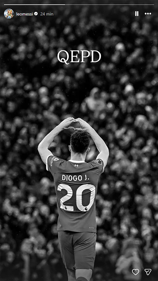 La "Pulga" utilizó su cuenta personal de Instagram para enviar un breve pero emotivo mensaje de despedida. A través de una historia, compartió una imagen en blanco y negro de Jota haciendo un gesto de corazón hacia la tribuna de Anfield, acompañado por las siglas “QEPD”. El astro argentino no compartió cancha con el portugués, pero su gesto refleja la dimensión de la pérdida.