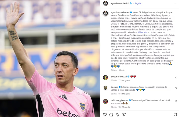 Agustín Marchesín atraviesa uno de los momentos más duros de su carrera. El arquero de Boca sufrió la ruptura de los ligamentos cruzados de su rodilla durante el encuentro ante Barcelona de Ecuador por la Copa Libertadores 2026, una lesión que lo dejará fuera de las canchas por al menos nueve meses. En medio del impacto emocional que significa una recuperación tan prolongada, el futbolista decidió expresarse públicamente con un mensaje cargado de angustia y sinceridad.