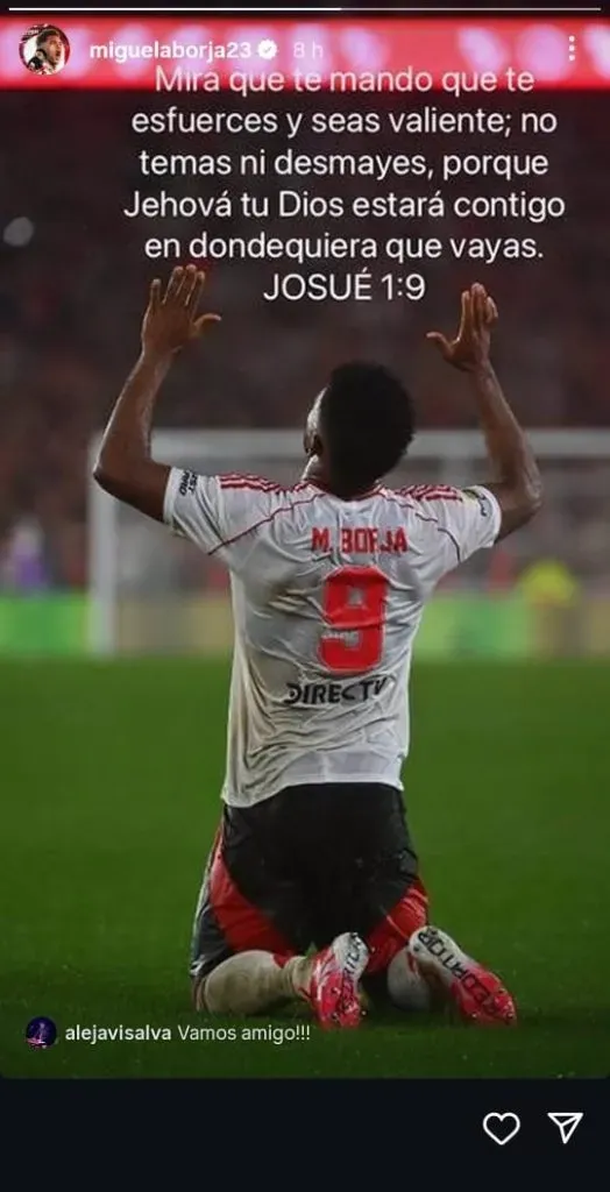 Poco después del triunfo 4-2 en el Monumental, Borja publicó en su cuenta de Instagram una historia que llamó la atención de los hinchas: una foto suya arrodillado, señalando al cielo, acompañada por un versículo bíblico: “Mira que te mando que te esfuerces y seas valiente; no temas ni desmayes, porque Jehová tu Dios estará contigo en dondequiera que vayas” (Josué 1:9).