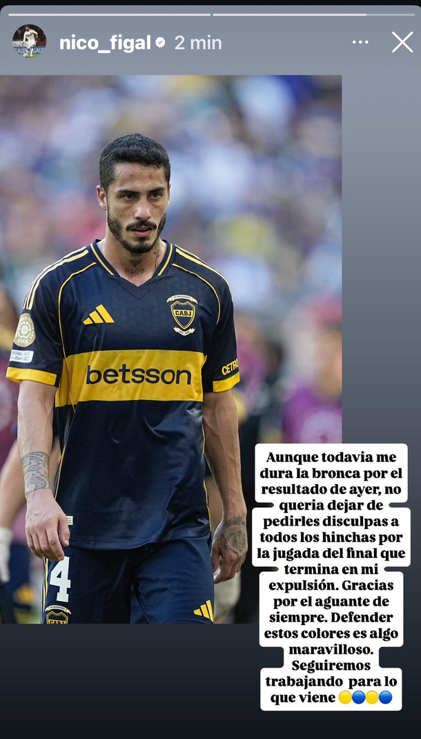 En una historia, reconoció el error y expresó su malestar: “Aunque todavía me dura la bronca por el resultado de ayer, no quería dejar de pedirles disculpas a los hinchas por la jugada del final que termina en mi expulsión”. Además, agradeció el apoyo de los fanáticos y remarcó su compromiso con el club: “Gracias por el aguante de siempre. Defender estos colores es algo maravilloso. Seguiremos trabajando para lo que viene”.