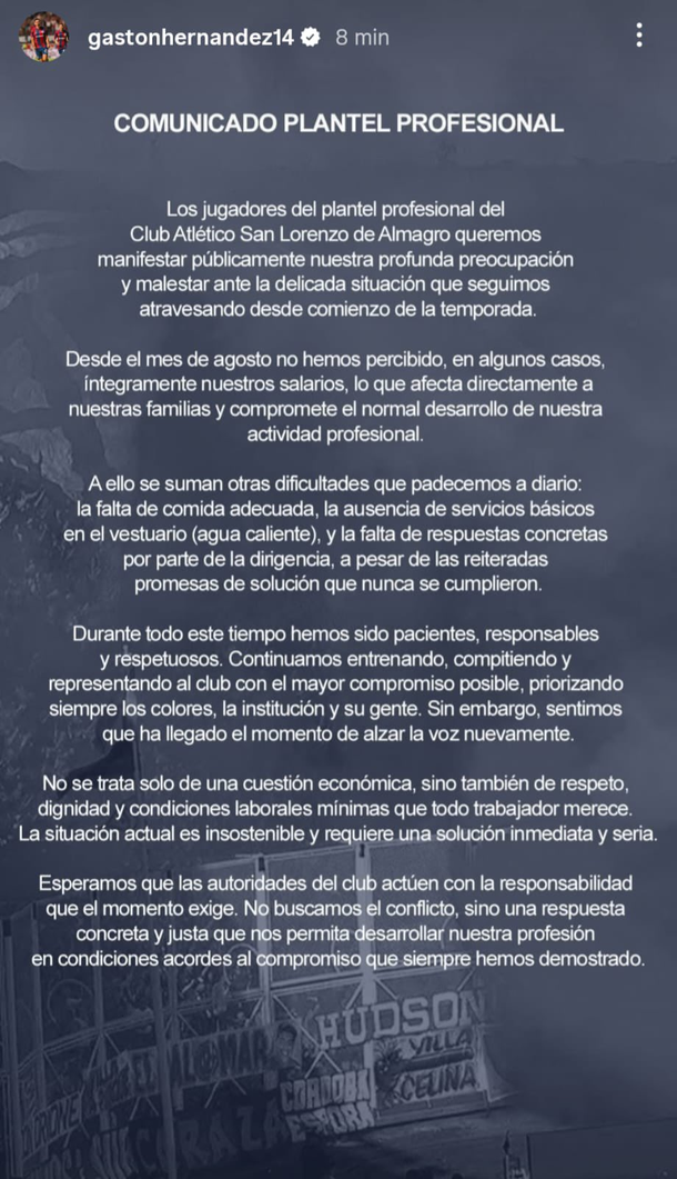 “El plantel profesional del Club Atlético San Lorenzo de Almagro quiere manifestar públicamente su profunda preocupación y malestar ante la delicada situación que seguimos atravesando desde comienzo de la temporada”, comenzó el texto, difundido inicialmente por el capitán Gastón Hernández y luego replicado por todo el plantel en sus redes sociales.