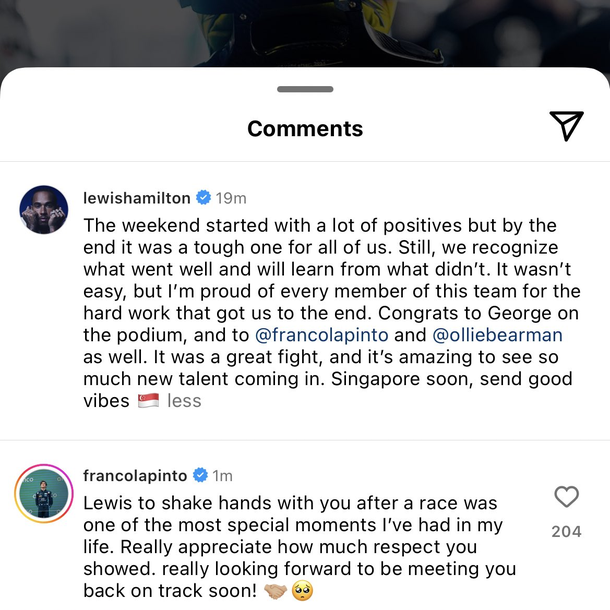 Este lunes, Hamilton le dedicó un posteo en Instagram que emocionó al argentino: "El fin de semana comenzó con muchas cosas positivas, aunque al final fue difícil para todos nosotros", escribió. "Aún así, reconocemos lo que salió bien y aprenderemos de lo que no lo hizo. Felicidades a George en el podio, y a @francolapinto y @olliebearman también. Fue una gran pelea, y es increíble ver tanto talento nuevo llegando", agregó.