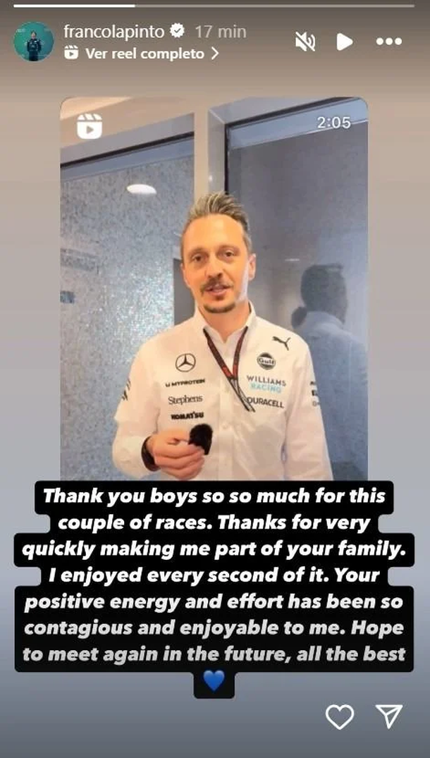 Estas palabras, compartidas en su cuenta oficial de Instagram, reforzaron la sensación de una despedida, aunque no definitiva. Si no consigue un asiento titular en otra escudería, continuaría ligado a Williams como piloto de pruebas, desempeñando funciones en simuladores, realizando test en circuitos y estando disponible en caso de emergencias que involucren a Albon o Sainz.