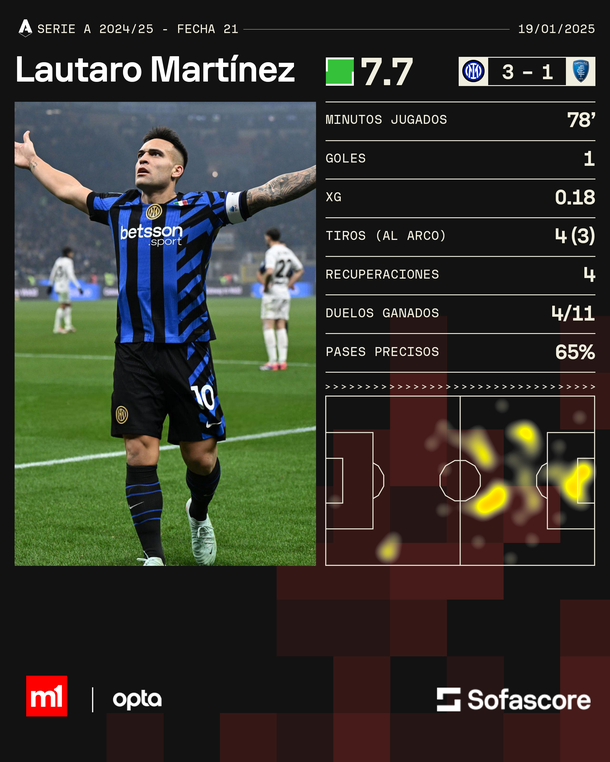 Lautaro Martínez fue el líder del equipo, ya que en los 78 minutos en cancha, además del gol, aportó cuatro tiros al arco y cuatro recuperaciones, entre otras buenas estadísticas.