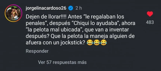 Allí, Cardoso comentó con ironía y molestia: “¡Dejen de llorar! Antes ‘le regalaban penales’, después ‘Chiqui lo ayudaba’, ahora ‘la pelota mal ubicada’”. Y, para rematar, agregó: “¿Qué van a inventar después? ¿Que alguien la manejó con un joystick desde afuera?”. Sus palabras no tardaron en viralizarse y generaron cientos de respuestas, algunas a favor y otras en contra.