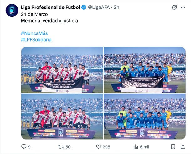 A lo largo de toda la jornada, las cuentas oficiales de la Liga Profesional fueron compartiendo las imágenes de los capitanes y sus equipos sosteniendo la insignia. Cada publicación fue acompañada por un texto breve pero cargado de simbolismo: "24 de Marzo. Memoria, verdad y justicia. #NuncaMás"
