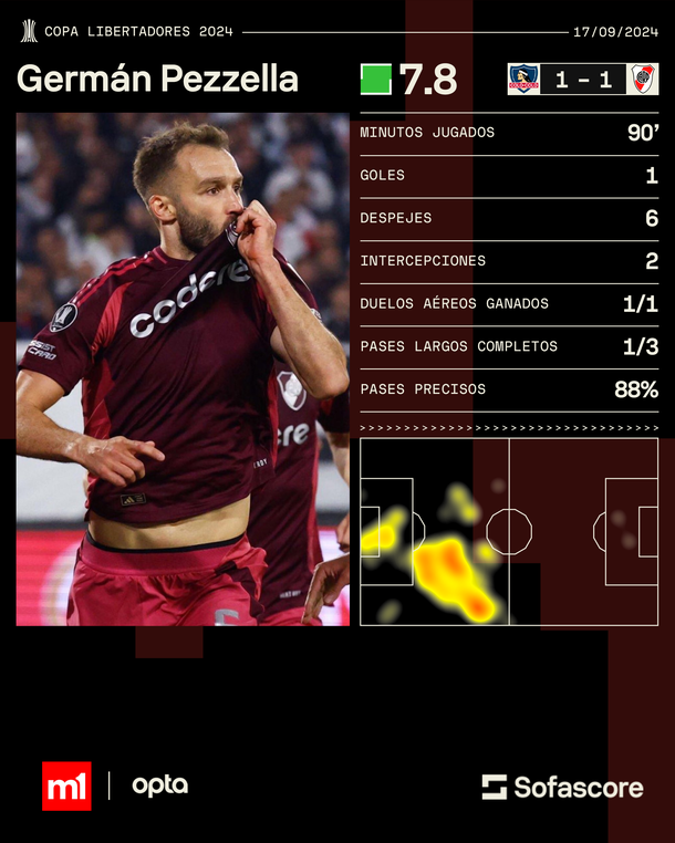Las estadísticas de Germán Pezzella en Colo Colo vs River