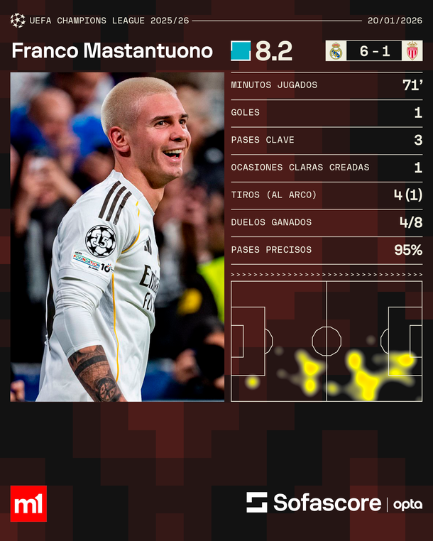 Renovado tanto por el look como por la dirección técnica de Álvaro Arbeloa, Franco Mastantuono parece haber encontrado el impulso necesario para relanzar su etapa en el Real Madrid, ya que este martes completó un partidazo por la Champions League, con un gol y una asistencia, para ganarse su primer ovación en el Santiago Bernabéu.