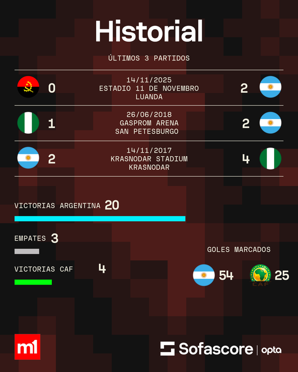 En los antecedentes más recientes también se observa una tendencia favorable para Argentina. En sus últimos cinco enfrentamientos ante selecciones de la Confederación Africana de Fútbol (CAF), obtuvo cuatro triunfos y una derrota.
