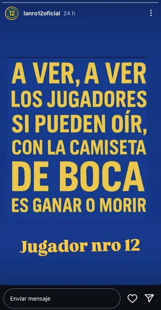 Justamente los jugadores fueron los principales apuntados por la barrabrava, aún comandada por Rafael Di Zeo. A través de una publicación en Instagram, "La 12" compartió una imagen que dejaba un claro aunque amenazante mensaje: "A ver, a ver, los jugadores si pueden oír, con la camiseta de Boca es ganar o morir".