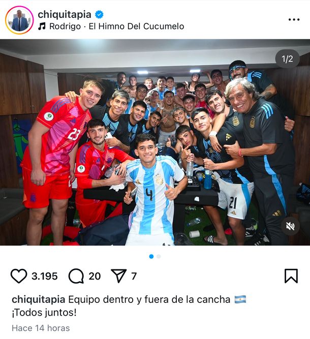 En otro posteo, el dirigente compartió una fotografía del equipo tomada en el vestuario tras la histórica goleada, resaltando la unión del plantel. “Equipo dentro y fuera de la cancha. Todos juntos”, expresó junto a un emoticón de la bandera argentina.