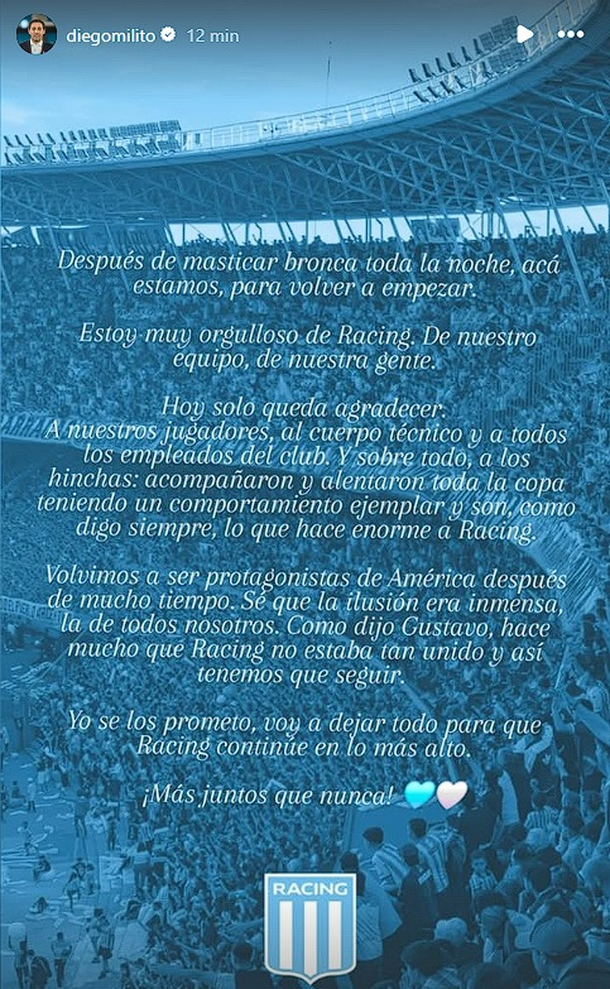 “Después de masticar bronca toda la noche, acá estamos, para volver a empezar. Estoy muy orgulloso de Racing. De nuestro equipo, de nuestra gente. Hoy solo queda agradecer. A nuestros jugadores, al cuerpo técnico y a todos los empleados del club. Y sobre todo a los hinchas: acompañaron y alentaron toda la copa teniendo un comportamiento ejemplar y son, como digo siempre, lo que hace enorme a Racing”, escribió Milito.