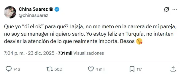 A través de su cuenta oficial de X, la China fue tajante y negó cualquier tipo de influencia en el futuro deportivo de Icardi. “¿Que yo di el ok para qué? Jajaja, no me meto en la carrera de mi pareja, no soy su manager ni quiero serlo“, escribió. Además, la actriz dejó en claro su presente personal y apuntó contra las versiones que circularon en las últimas horas: “Yo estoy feliz en Turquía, no intenten desviar la atención de lo que realmente importa. Besos”.