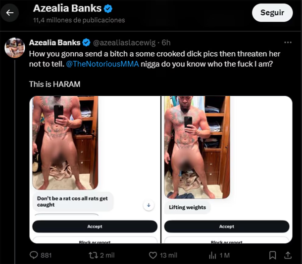 El conflicto se desató luego de que Banks publicara en su cuenta de X (ex Twitter) dos imágenes explícitas que, según aseguró, le fueron enviadas por el propio McGregor. “¿Cómo vas a acosarme sexualmente y luego amenazarme para que no lo diga? ¿Tío, sabés quién soy?”, escribió la artista, visiblemente indignada. En su posteo, además, denunció que el ex campeón intentó intimidarla para que no lo hiciera público: “Esto es haram”, agregó, usando el término islámico que refiere a lo prohibido o pecaminoso.