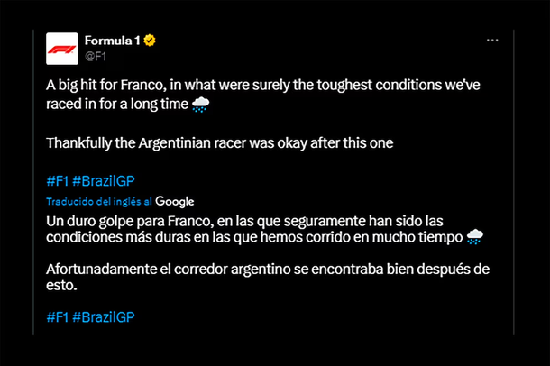 “Fue un duro golpe para Franco, en las que seguramente han sido las condiciones más duras en las que hemos corrido en mucho tiempo. Afortunadamente, el corredor argentino se encontraba bien después de esto”, comunicó la F1 a través de sus redes sociales, mostrando su apoyo al joven piloto y el video del impacto desde diferentes ángulos.