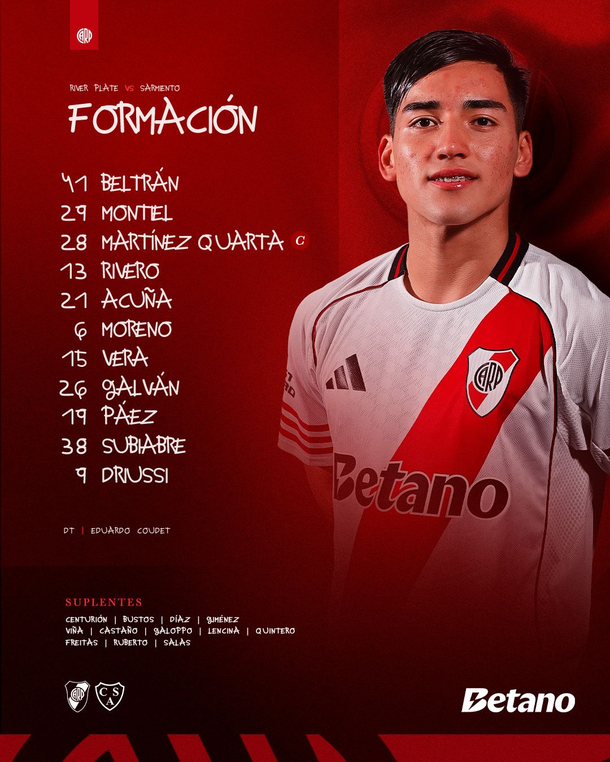 Para este compromiso, Coudet decidió apostar por una base similar a la del debut, con algunos nombres que empiezan a perfilarse como piezas importantes dentro del nuevo esquema. La formación de River sería con: Santiago Beltrán; Gonzalo Montiel, Lucas Martínez Quarta, Lautaro Rivero, Marcos Acuña; Fausto Vera, Aníbal Moreno, Tomás Galván, Kendry Páez; Ian Subiabre y Sebastián Driussi. DT: Eduardo Coudet.