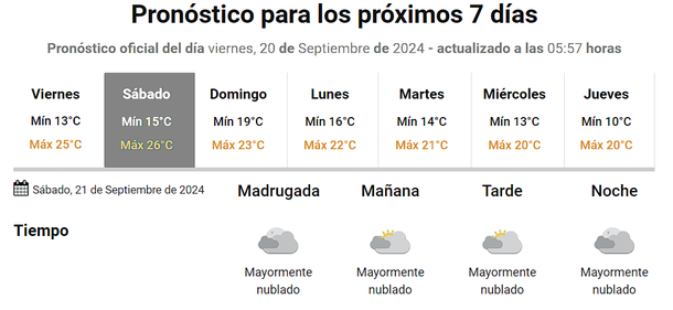 Aunque las condiciones climáticas no serán perfectas, la previsión indica que el día estará parcialmente nublado por la mañana y mediodía, con algunos rayos de sol dispersos, y que por la tarde-noche el cielo se cubrirá completamente, pero sin señales de lluvia.