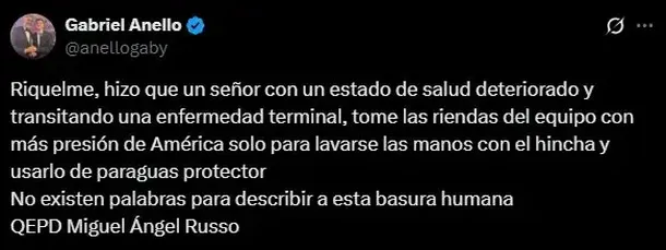 El repudiable posteo de Gabriel Anello contra Juan Román Riquelme tras la muerte de Miguel Ángel Russo: "Basura humana"