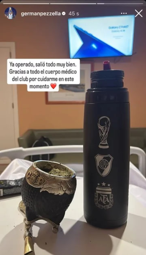 Tras la intervención, el campeón del mundo compartió un mensaje de agradecimiento en sus redes sociales: “Ya operado, salió todo muy bien. Gracias a todo el cuerpo médico del club por cuidarme en este momento”, escribió Pezzella junto a una foto en la que se lo ve con un mate y un termo con los escudos de River y la Selección Argentina, además del trofeo del Mundial.