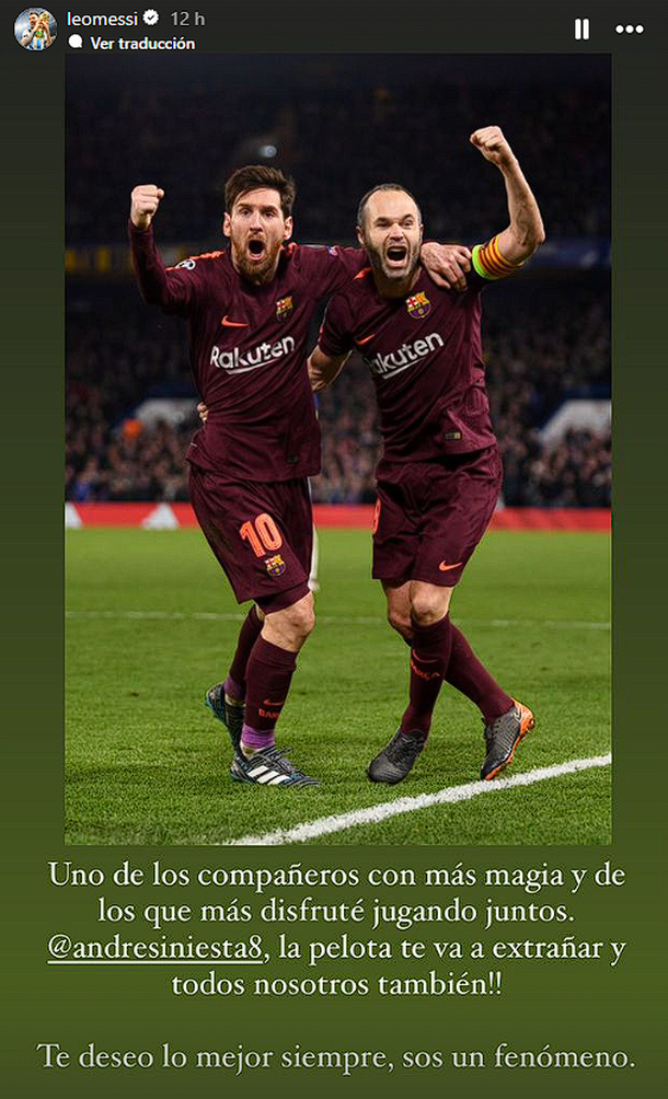 "Uno de los compañeros con más magia y de los que más disfruté jugando juntos. Andrés Iniesta, la pelota te va a extrañar y todos nosotros también. Te deseo lo mejor siempre, sos un fenómeno", escribió el capitán argentino.