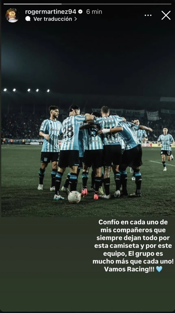 A través de su cuenta de Instagram, el delantero colombiano publicó una historia que, aunque no mencionaba directamente a Arias, parecía claramente dirigida a él. En la imagen, que mostraba a varios jugadores celebrando un gol, escribió: "Confío en cada uno de mis compañeros que siempre dejan todo por esta camiseta y por este equipo. El grupo es mucho más que cada uno! Vamos Racing!!!".