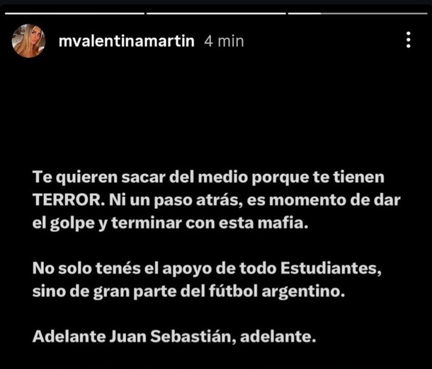 En un segundo texto, Valentina afirmó que a Verón lo "quieren sacar del medio" porque le "tienen terror", y sentenció: "Ni un paso atrás, es momento de dar el golpe y terminar con esta mafia. No solo tenés el apoyo de todo Estudiantes, sino de gran parte del fútbol argentino. Adelante Juan Sebastián, adelante".