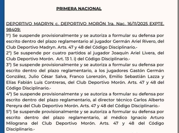 Del lado de Morón, las sanciones alcanzaron a Joaquín Livera, Gastón González, Julio Salvá, Franco Lorenzón, Emilio Lazza y Elías Contreras, todos implicados en diferentes focos de conflicto. Según el parte oficial, González habría dado inicio a los disturbios apenas sonó el silbato final, lo que sumó gravedad a su situación disciplinaria.