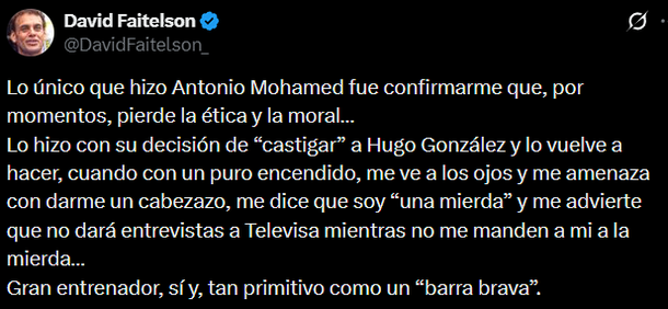En su mensaje, sostuvo que Mohamed había confirmado su pérdida de ética y moral, tanto por la decisión con el arquero como por la manera en la que lo enfrentó personalmente. “Lo único que hizo Antonio Mohamed fue confirmarme que, por momentos, pierde la ética y la moral… Lo hizo con su decisión de ‘castigar’ a Hugo González y lo vuelve a hacer, cuando con un puro encendido, me ve a los ojos y me amenaza con darme un cabezazo, me dice que soy ‘una mierda’ y me advierte que no dará entrevistas a Televisa mientras no me manden a mí a la mierda… Gran entrenador, sí y, tan primitivo como un ‘barra brava’”, escribió.