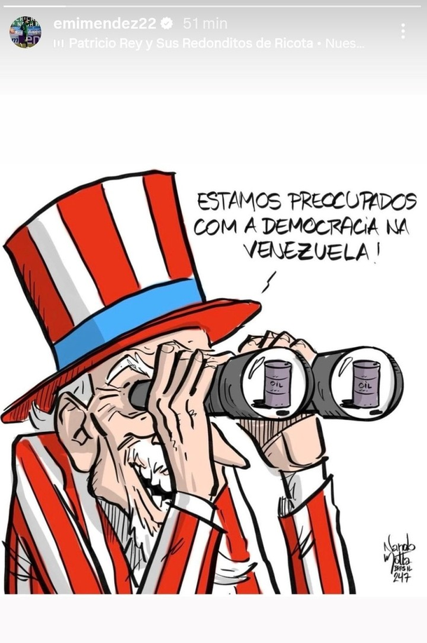 Sin embargo, otro integrante del plantel manifestó una mirada totalmente distinta. Emiliano Méndez publicó una caricatura en la que se observa a un ciudadano norteamericano que aparenta reflexionar sobre la democracia de otros países mientras fija su atención en el petróleo, en una crítica directa a la intervención de Estados Unidos en Venezuela.