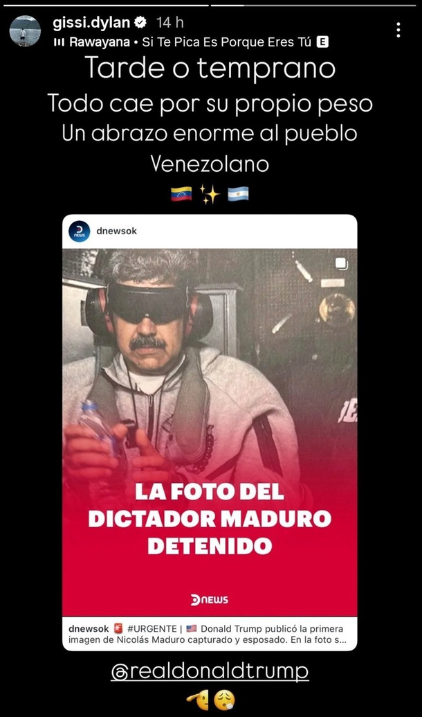 Por un lado, Dylan Gissi se mostró a favor de la decisión tomada por la administración de Donald Trump. El futbolista compartió la primera imagen que circuló de Nicolás Maduro esposado y acompañó la publicación con un mensaje propio: “Tarde o temprano todo cae por su propio peso. Un abrazo enorme al pueblo venezolano”.