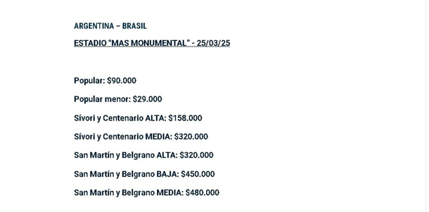 En el Monumental, para el clásico ante Brasil, los precios de las entradas generales llegaron hasta los 90.000 pesos argentinos, lo que equivale a una suma considerablemente más alta. Mientras tanto, las entradas más caras para ver a la Scaloneta en el Monumental alcanzaron los 480.000 pesos.