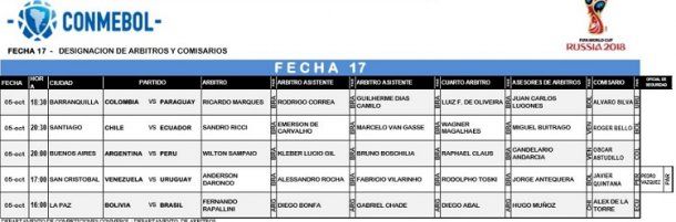 El único cruce que no tendrá un árbitro de Brasil será el que protagonice precisamente el equipo de Tité, que visitará la altura de La Paz para enfrentar a Bolivia (ya sin chances), con el arbitraje del argentino Fernando Rapallini.