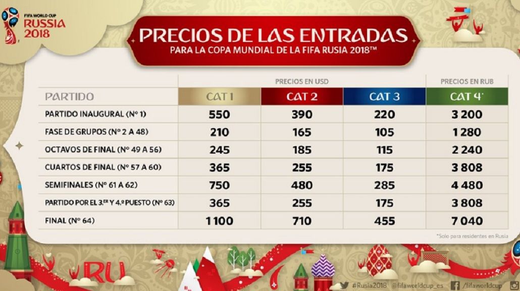 Entre los valores publicados, una entrada de categoría 3 para un partido de fase de grupos cuesta U$S105 (unos $1790), mientras que la misma entrada para octavos de final cotiza U$S115 ($1960) y para cuartos, U$S175 (casi $3000).