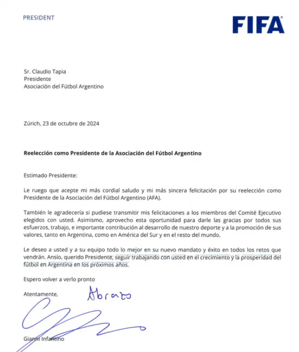 "Le ruego que acepte mi más cordial saludo y mi más sincera felicitación por su reelección como Presidente de la Asociación del Fútbol Argentino (AFA)", comenzó la carta del titular de la FIFA. Y además, agregó: "También le agradecería si pudiese transmitir mis felicitaciones a los miembros del Comité Ejecutivo elegidos con usted. Asimismo, aprovecho esta oportunidad para darle las gracias por todos sus esfuerzos, trabajo, e importante contribución al desarrollo de nuestro deporte y a la promoción de sus valores, tanto en Argentina, como en América del Sur y en el resto del mundo".