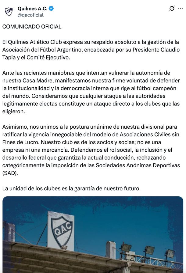 "El Quilmes Atlético Club expresa su respaldo absoluto a la gestión de la Asociación del Fútbol Argentino, encabezada por su Presidente Claudio Tapia y el Comité Ejecutivo.