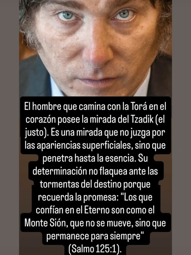 La publicación fue difundida en su perfil oficial e incluyó una reflexión directa sobre la confianza en Dios y la firmeza ante los grandes desafíos cotidianos. "El hombre que camina con la tora en el corazón posee la mirada del Tzadik (el justo). Es una mirada que no juzga por las apariencias superficiales, sino que penetra hasta la esencia", indica el primer tramo del texto.