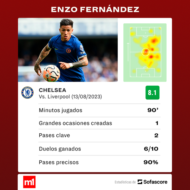 En el debut oficial del santafesino, Mauricio Pochettino, y con Enzo Fernández de titular, el colombiano Luis Díaz abrió el marcador para Liverpool, que tuvo a Alexis Mac Allister de arranque, los 18 minutos del primer tiempo, pero Axel Disasi igualó para el local, a los 37 de la etapa inicial.