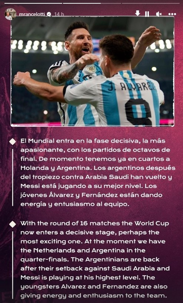 En su análisis por redes sociales, Carlo Ancelotti, el entrenador del Real Madrid, le dedicó una columna a la Selección Argentina tras sellar su pase a los cuartos de final y comenzó por destacar a Lionel Messi. "Está en su mejor nivel", escribió. Luego, el elogio fue para Enzo y Julián: "Le están dando energía y entusiasmo al equipo".