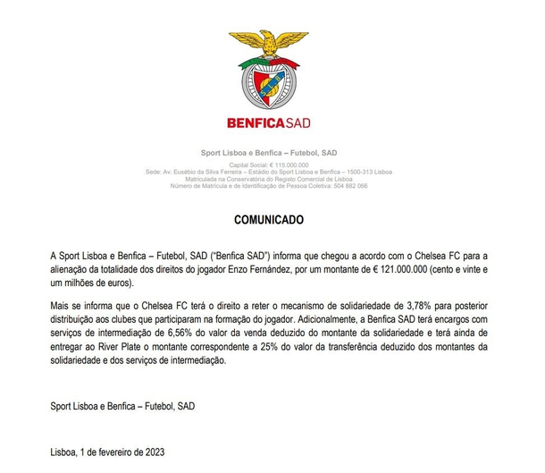 El comunicado de Benfica confirmando la venta de Enzo Fernández.