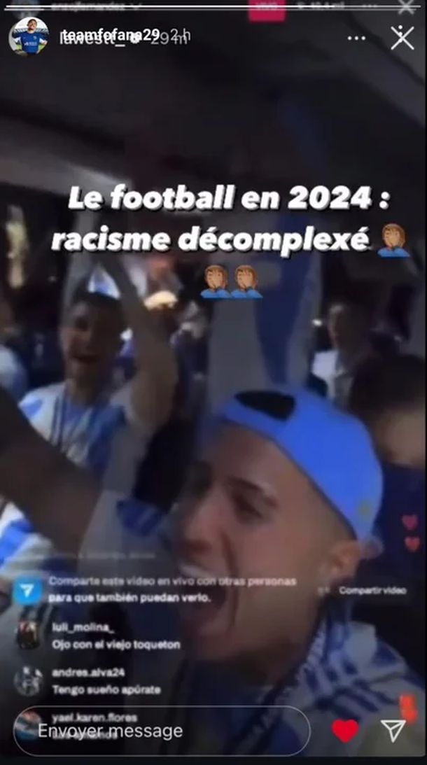 El futbolista francés Wesley Fofana acusó de “racista” al argentino Enzo Fernández, su compañero de Chelsea de Inglaterra, por redes sociales con un mensaje contundente: “El fútbol en 2024, racismo sin complejos”. La dura acusación llegó porque el mediocampista realizó un directo por redes sociales, en el cual los festejos por la obtención de la Copa América sobrepasaron el tono de la broma y se convirtieron en una ofensa para distintos integrantes del plantel.