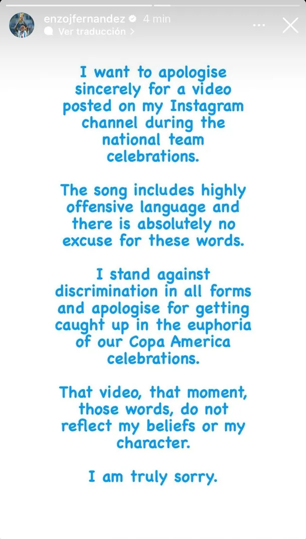 "Quiero disculparme sinceramente por un video subido a mi Instagram durante las celebraciones de la Selección nacional. La canción incluye un lenguaje muy ofensivo y no hay ninguna excusa para estas palabras", comenzó su descargo a través de las historias. Y además, agregó: "Me opongo a la discriminación en todas sus formas y me disculpo por quedar atrapado en la euforia de nuestra celebración de Copa América", indicó el ex River, luego de ser tildado de 'racista' por su compañero de club, Wesley Fofana.