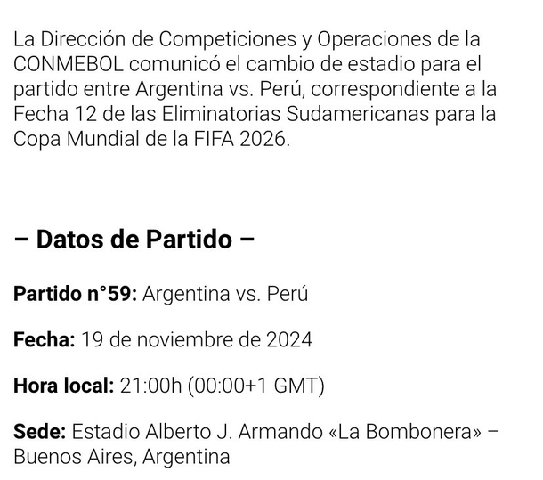 La Conmebol confirmó oficialmente que la Selección Argentina jugará en La Bombonera, la icónica cancha de Boca, en el duelo correspondiente a la 12ª fecha de las Eliminatorias Sudamericanas. El partido se disputará el próximo 19 de noviembre a las 21:00, siendo esta la segunda ocasión en estas eliminatorias que el seleccionado nacional hará de local en este estadio.
