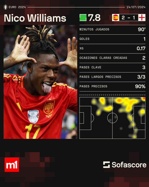 En el arranque del segundo tiempo, y luego de un tremendo pase de Lamine Yamal, el futbolista Niko Williams pisó el área y con toda la libertad del mundo definió de la mejor manera para poner el triunfo parcial de España ante Inglaterra en la final de la Eurocopa 2024 que se está disputando en Alemania.