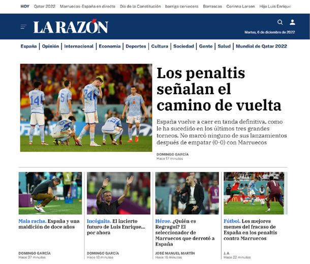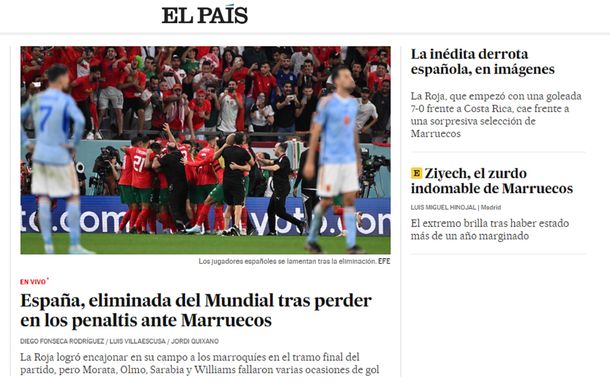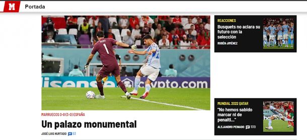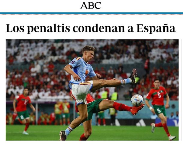 Por su parte, El Mundo tituló: "España desaparece en una tanda de penaltis desastrosa y dice adiós al Mundial". También, pusieron el ojo en Luis Enrique y compararon esta derrota con la que sufrieron en Rusia 2018, donde luego de empatar 1 a 1, perdieron con el anfitrión por penales 4 a 3.