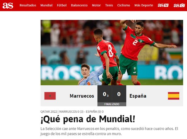 El otro gran medio deportivo español, AS tituló: "¡Qué pena de Mundial!", le hace un tiro por elevación a Luis Enrique, señalando: "El juego de los mil pases se estrella contra un muro".