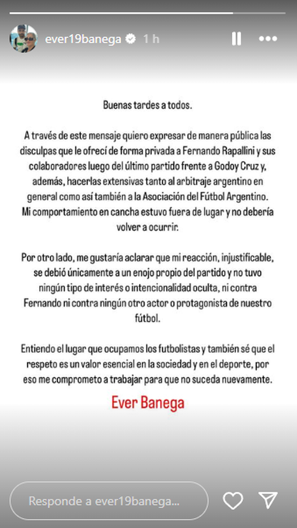 "A través de este mensaje quiero expresar de manera pública las disculpas que le ofrecí de manera privada a Fernando Rapallini y sus colaboradores luego del último partido ante Godoy Cruz y, además, hacerlas extensivas tanto al arbitraje argentino en general como así también a la Asociación del Fútbol Argentino. Mi comportamiento en cancha estuvo fuera de lugar y no debería volver a ocurrir.